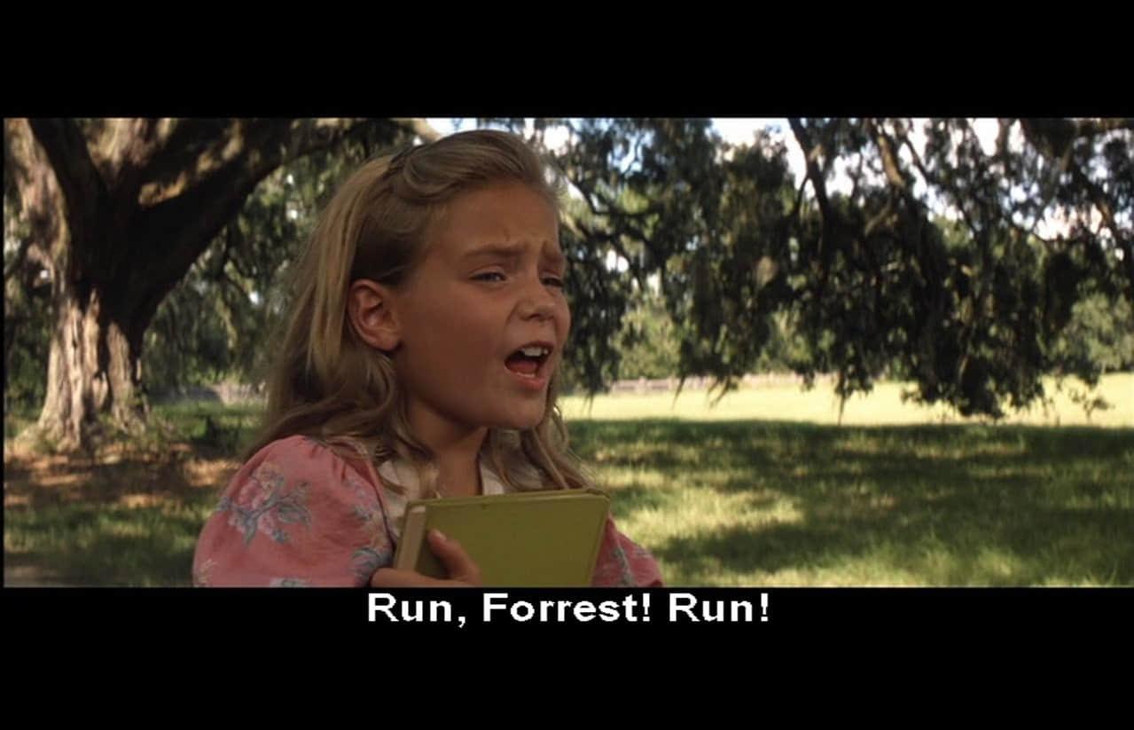 阿甘正传里,当阿甘被欺负的时候,珍妮总会喊「Run, Forrest, Run!」。