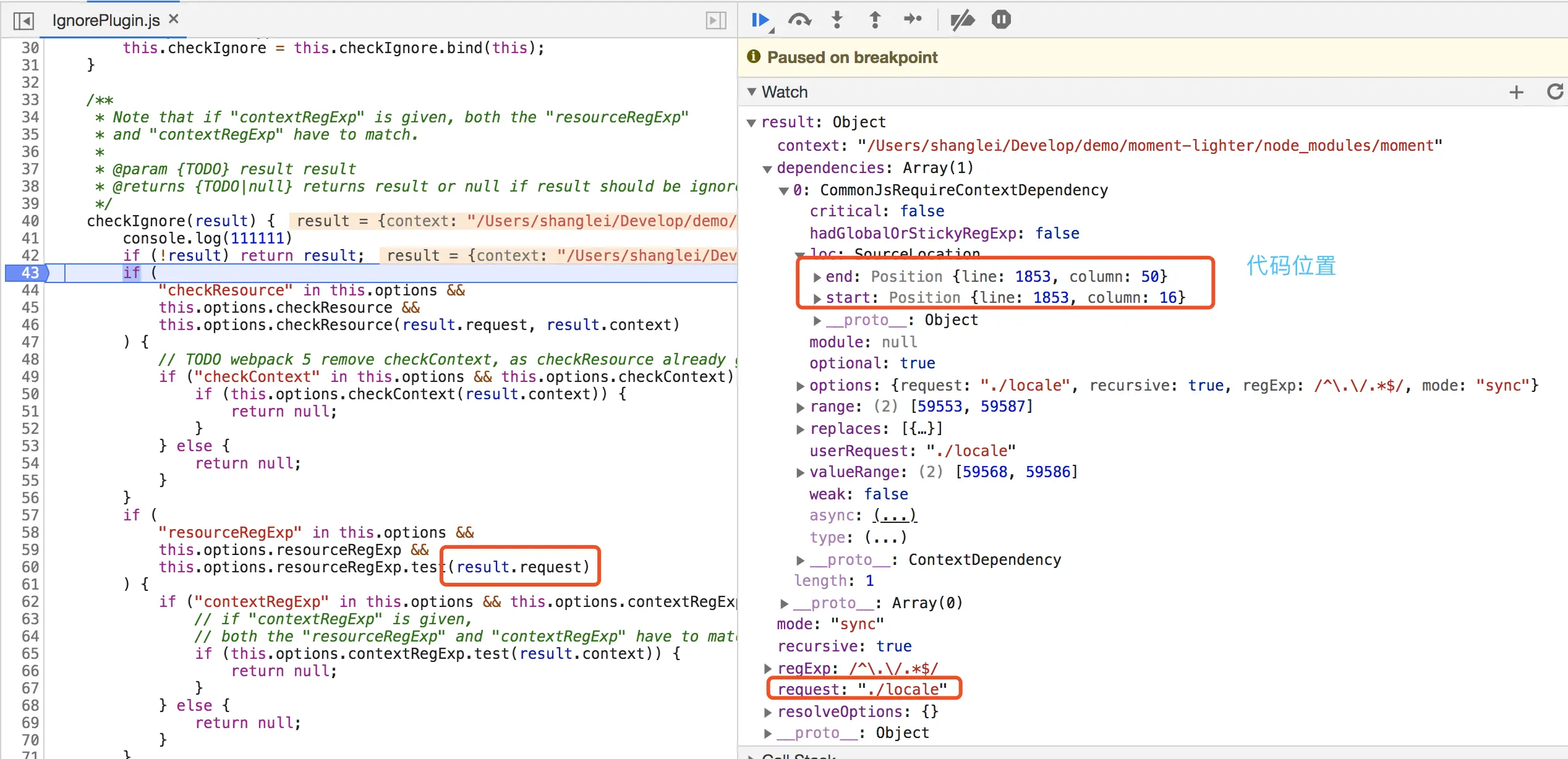 moment包编译后的文件并未找到完全匹配/^\.\/locale$/这个正则的引入语句,只有aliasedRequire('./locale/' + name)这条语句和locale相关, 却又和正则匹配不上, 倒是在moment的src源文件中有import ... from './locale'。 但是在moment的package.json中main是指向编译后的文件并不是src文件,这就奇了怪了, 于是debug IgnorePlugin看了一下。