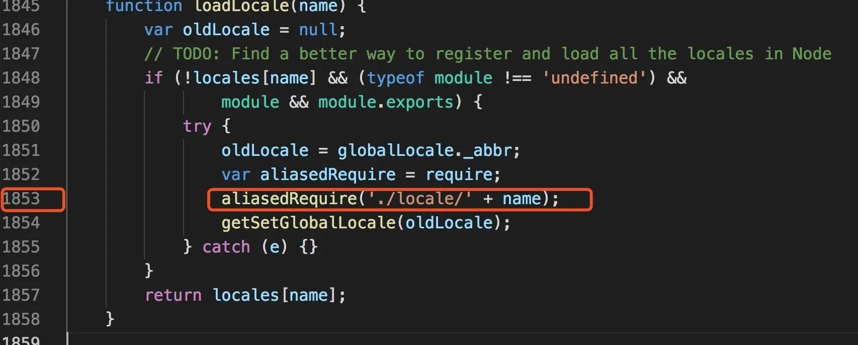 ./locale, 眼瞎了还是webpack的问题?按照dependencies的位置1853行查看moment编译后的文件, 定位到了确实是aliasedRequire('./locale/' + name), 怎么回事?