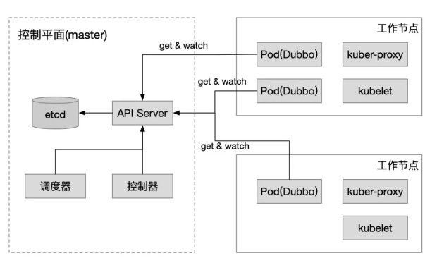 Pod的容器中部署的dubbo应用,服务注册流程可以直接删除,服务发现功能通过和Api Server进行交互,获取Pod和service信息,同时watch Pod和service的变更。通过这种方式之后,服务治理相关的信息也可以通过Api Server直接获取。