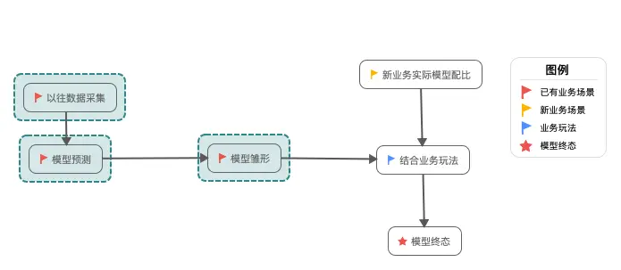 - 已有业务场景:采集以往数据并做处理,作为预测数据,形成一个模型雏形,结合新的业务玩法,行程已有业务的模型;