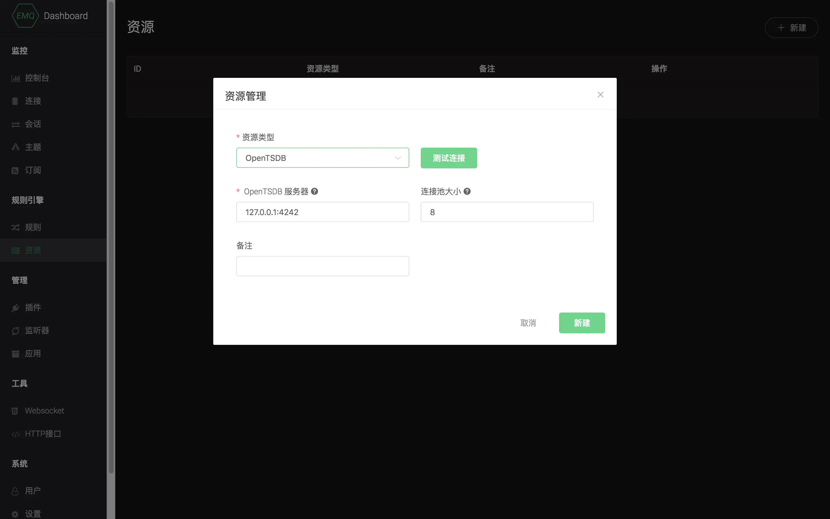 打开 EMQ X Dashboard,进入左侧菜单的 资源 页面,点击 新建 按钮,选择 OpenTSDB 资源类型并完成相关配置进行资源创建。