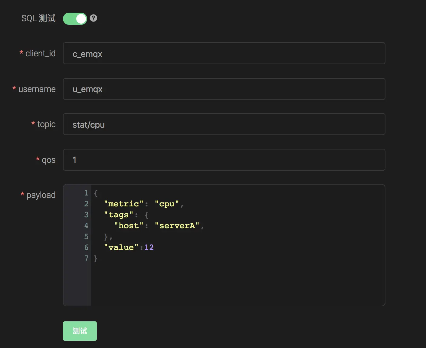 借助 SQL 测试功能,我们可以快速确认刚刚填写的 SQL 语句能否达成我们的目的。首先填写用于测试的 payload 等数据如下:
