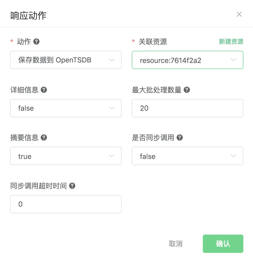 点击响应动作中的 添加 按钮,选择 保存数据到 OpenTSDB 动作,选取刚刚创建的 OpenTSDB 资源并完成剩余参数设置。OpenTSDB 动作用到的几个参数分别为:
