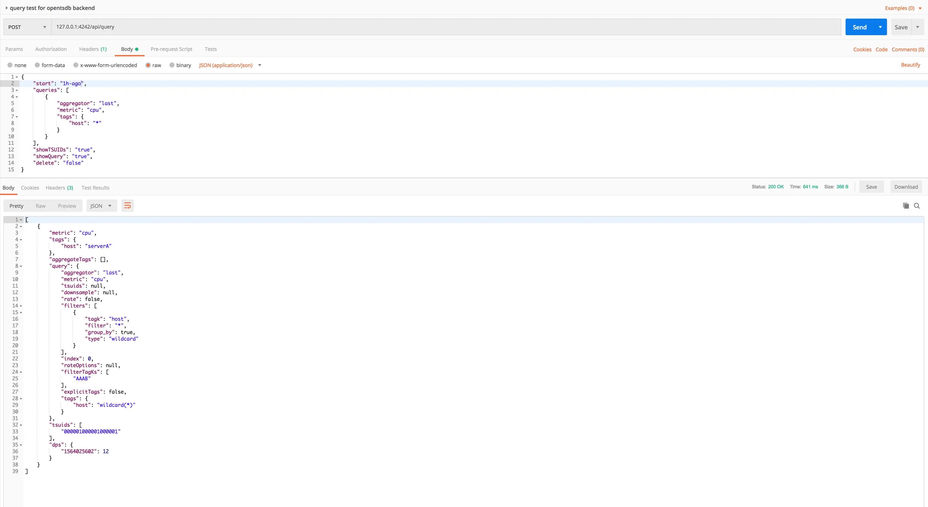 然后通过 Postman 向 OpenTSDB 发送查询请求,当我们得到如下应答时说明新的 data point 已经添加成功: