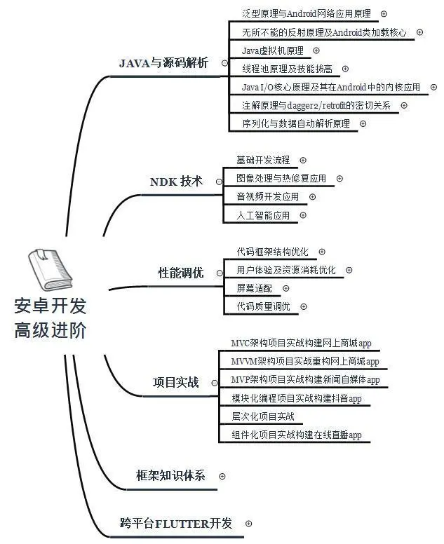 泛型原理丶反射原理丶Java虚拟机原理丶线程池原理丶注解原理丶序列化 Activity知识体系(Activity的生命周期丶Activity的任务栈丶Activity的启动模式丶View源码丶Fragment内核相关丶service原理等) 代码框架结构优化(数据结构丶排序算法丶设计模式) APP性能优化(用户体验优化丶适配丶代码调优) 热修复丶热升级丶Hook技术丶IOC架构设计 NDK(c编程丶C++丶JNI丶LINUX) 如何提高开发效率? MVC丶MVP丶MVVM 微信小程序 Hybrid Flutter