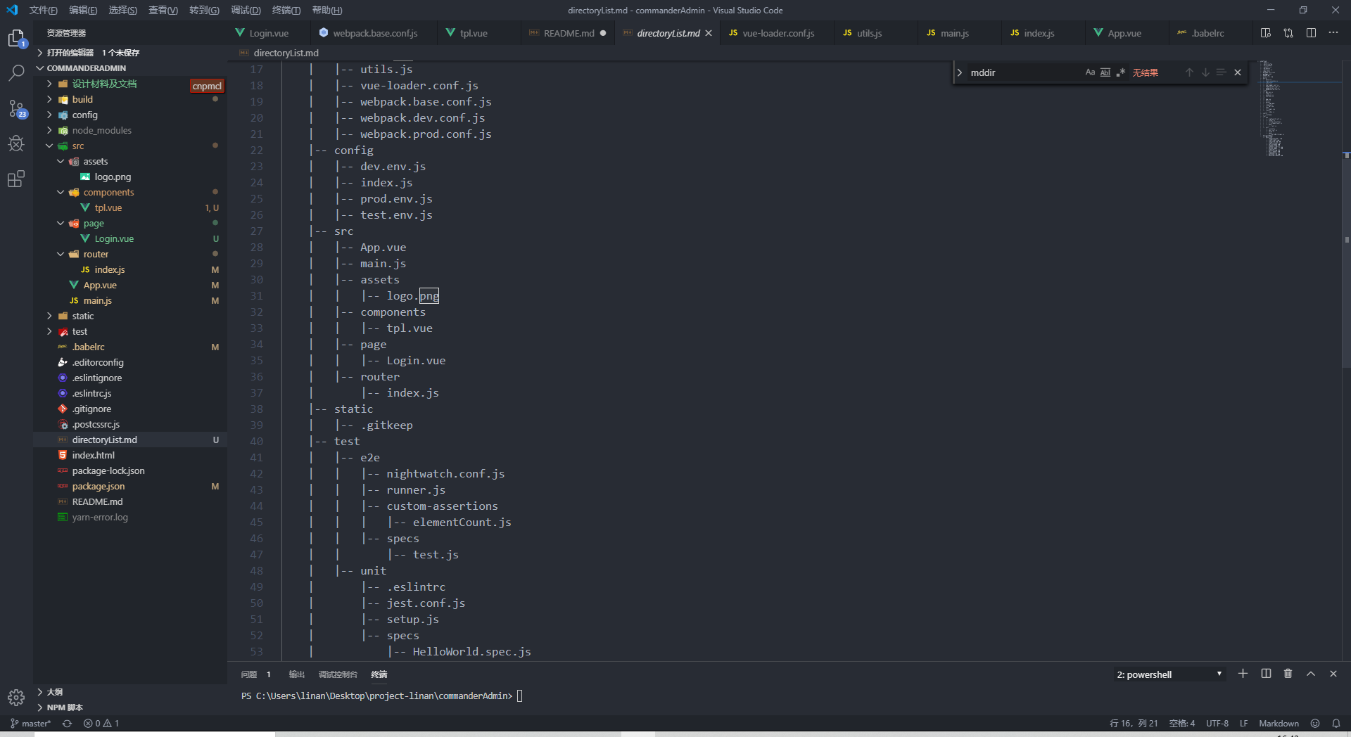自动生成 README.md 项目目录结构 linan0110 2019-11-05 5,215 阅读1分钟 自动生成 README.md 项目目录结构 工具 mddir 用法: 1.使用npm或yarn安装mddir $ npm install mddir -D 或 $ yarn add mddir -D 2.执行命令 $ node node_modules/mddir/src/mddir 然后会在当前目录生成一个 directoryList.md 文件 打开如图所示就生成了项目目录结构, 后面则可复制到README.md中