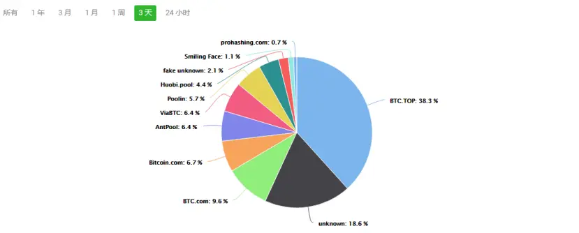 上图是BCH三天时间里的算力占比情况,匿名算力在其中占据了一定的比重,据悉,该匿名算力隶属于币印矿池,前段时间的”BCH网络1小时出21个区块“事件就是由于该矿池快速切换大量算力所致。