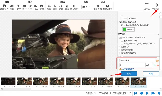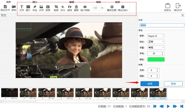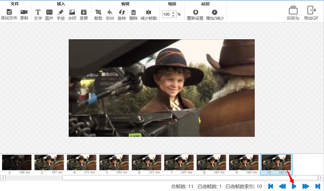 5、预览过可以进行一些编辑操作,来对GIF图片进行加工处理。如插入图片、文字,旋转、裁剪、减少帧数,缩放帧的大小等等。