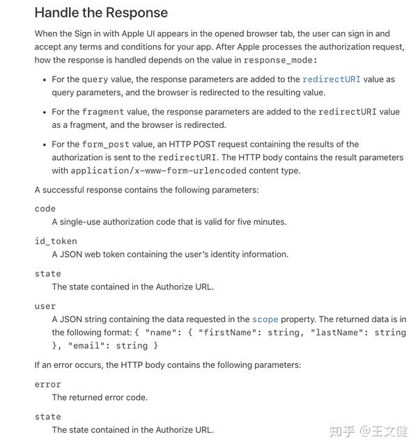 - redirect_uri: 设置的重定向url,当用户同意授权后,会发起一个该URL的post请求,开发者需要在后台设置相应接口去接收他,服务端通过apple传来的code参数去请求身份令牌,必传。