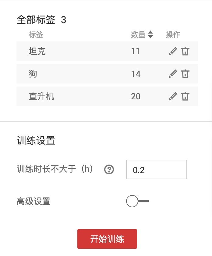右侧的标签栏会显示每种分类和对应的图片数量,下方的训练设置可以让我们设置训练时长的上限,高级设置中还有推理时间。