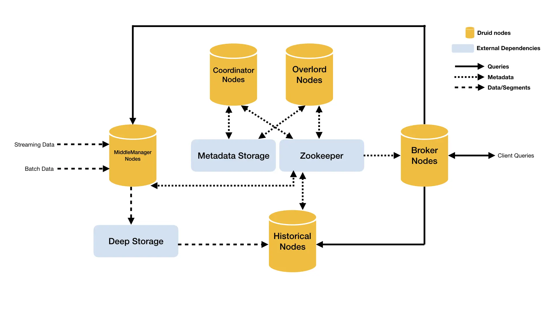 - Router 节点:可选节点,在 Broker 集群之上的API网关,有了 Router 节点 Broker 不在是单点服务了,提高了并发查询的能力,而且集群可以根据数据情况做分层路由,使整个集群变得灵活很多。