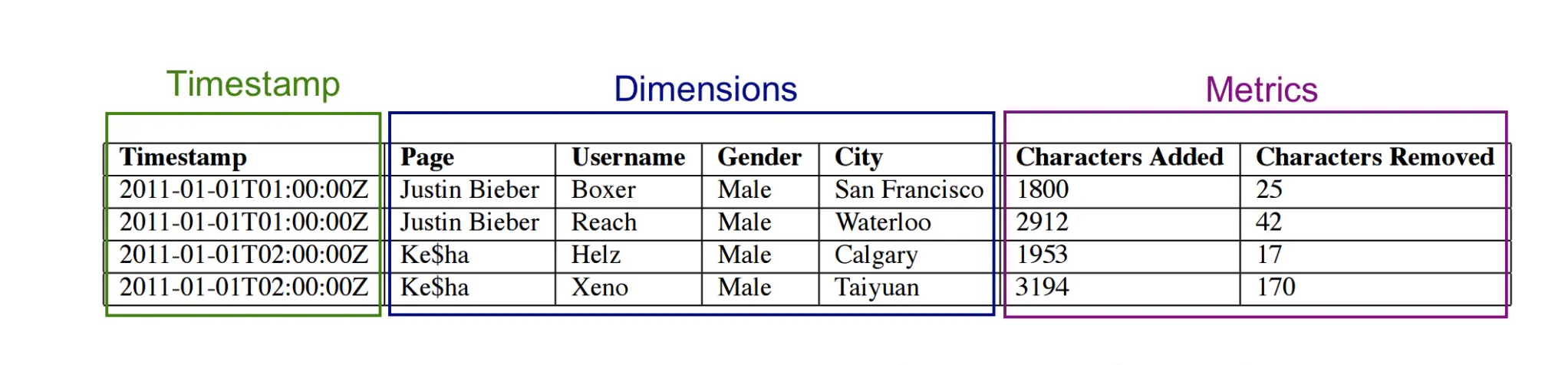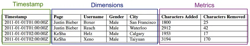 Druid中的列主要分为3类:时间列,维度列,指标列。Druid在数据摄入和查询时都依赖时间列,这也是合理的,因为多维分析一般都带有时间维度。维度和指标是OLAP系统中常见的概念,维度主要是事件的属性,在查询时一般用来filtering 和 group by,指标是用来聚合和计算的,一般是数值类型,像count,sum,min,max等。