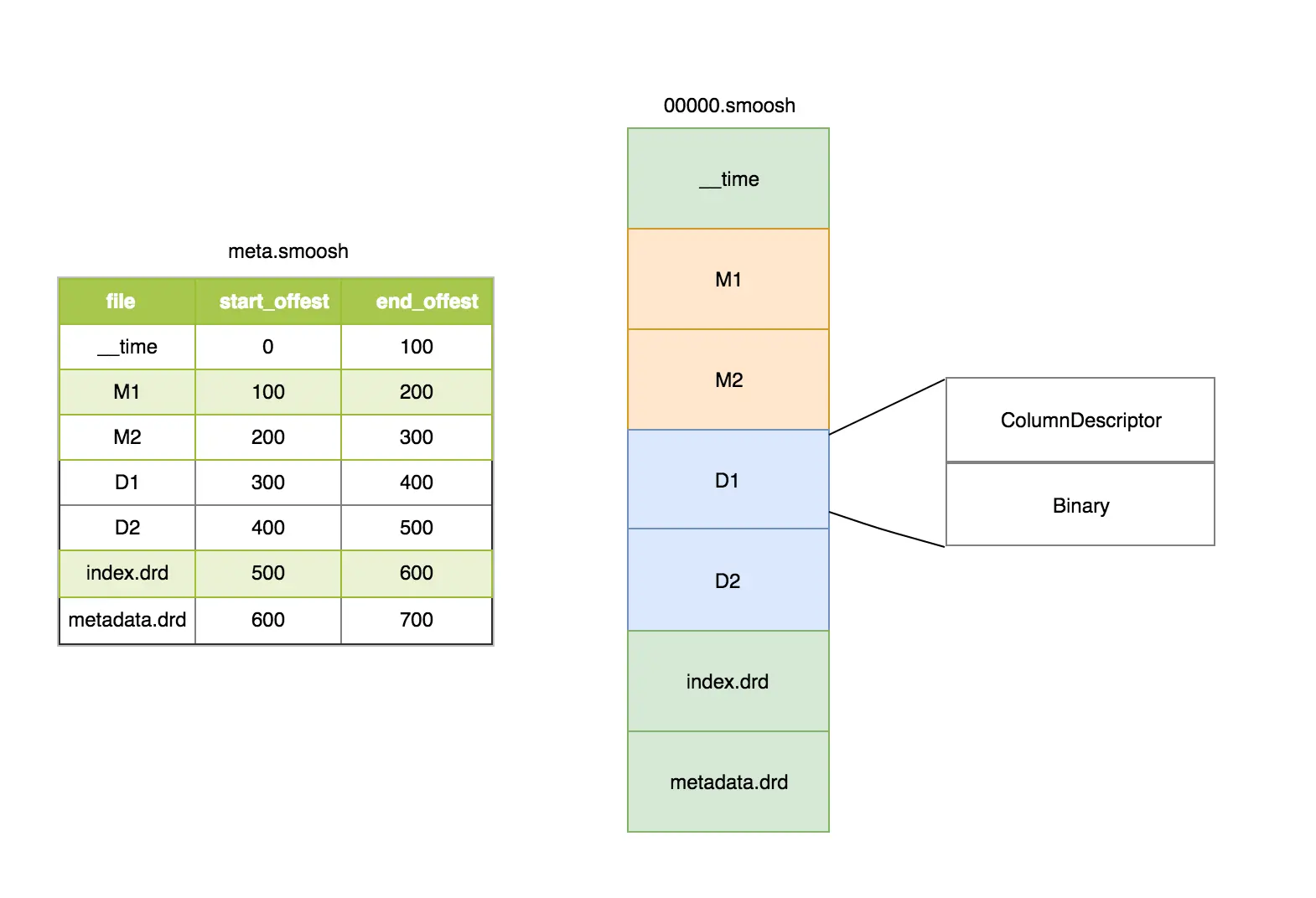 在smoosh文件中,数据是按列存储中,包含时间列,维度列和指标列,其中每1列会包含2部分:ColumnDescriptor和binary数据。其中ColumnDescriptor主要保存每1列的数据类型和Serde的方式。