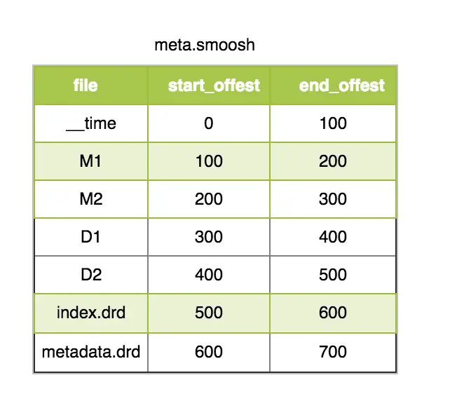 其中meta文件主要包含每1列的文件名和文件的偏移量。(注,druid为了减少文件描述符,将1个segment的所有列都合并到1个大的smoosh中,由于druid访问segment文件的时候采用MMap的方式,所以单个smoosh文件的大小不能超过2G,如果超过2G,就会写到下一个smoosh文件)。