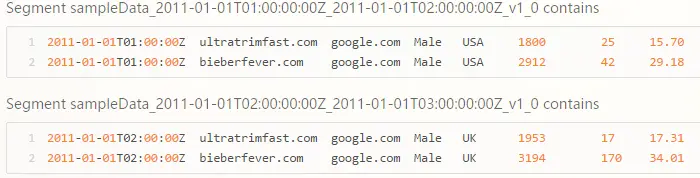 Druid的分片是Segment文件. Druid首先总是以时间撮进行分片, 因为事件数据总是有时间撮. 假设以小时为粒度创建下面的两个Segment文件
