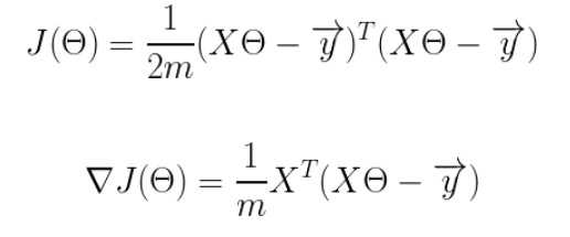 明确了代价函数和梯度,以及预测的函数形式。我们就可以开始编写代码了。但在这之前,需要说明一点,就是为了方便代码的编写,我们会将所有的公式都转换为矩阵的形式,python中计算矩阵是非常方便的,同时代码也会变得非常的简洁。