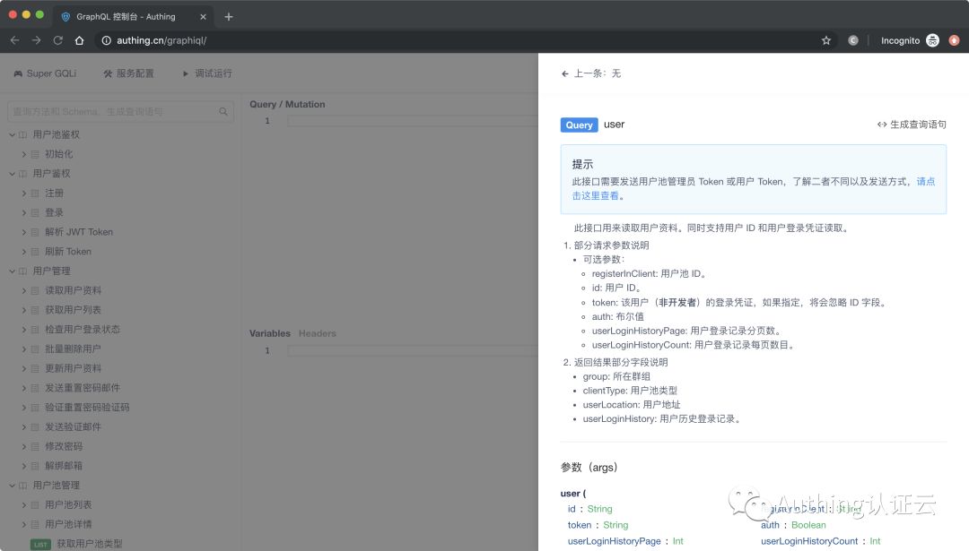 RESTful API 相比 GraphQL 更容易调试,Authing 为了解决 GraphQL 难调试的问题,他们做了一款在线调试 Authing GraphQL 的工具,如下所示: