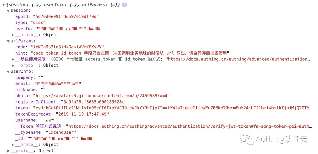 const authing = new AuthingSSO({ appId: "5d70d0e991fdd597019df70d", // OIDC 应用的 ID appType: "oidc", // SSO 类型为 OIDC 类型 appDomain: "sample-sso.authing.cn" });const callTrackSession = async function() { const res = await authing.trackSession(); if (!res.session) { console.log('未登录'); }else { console.log(res); }};callTrackSession()