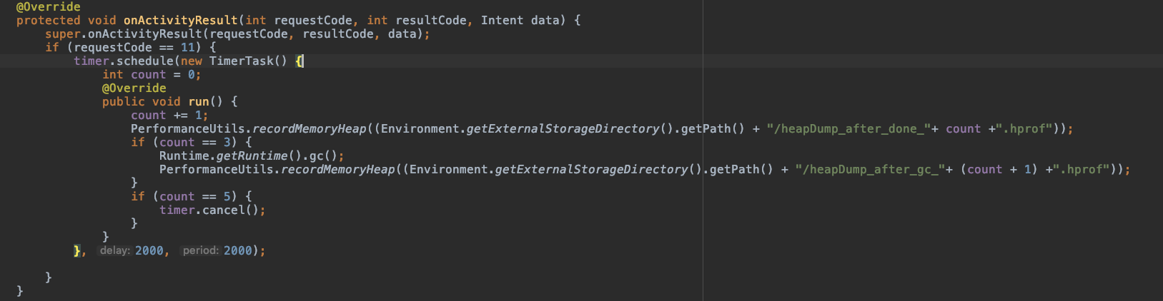 3、回到上一个Activity之后,在onActivityResult中再次记录内存堆栈,并触发一次GC