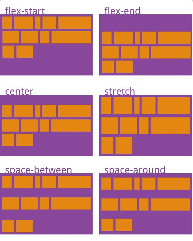 space-between:与交叉轴两端对齐,主轴线之间的间隔平均分布。(多主轴分在交叉轴两侧)