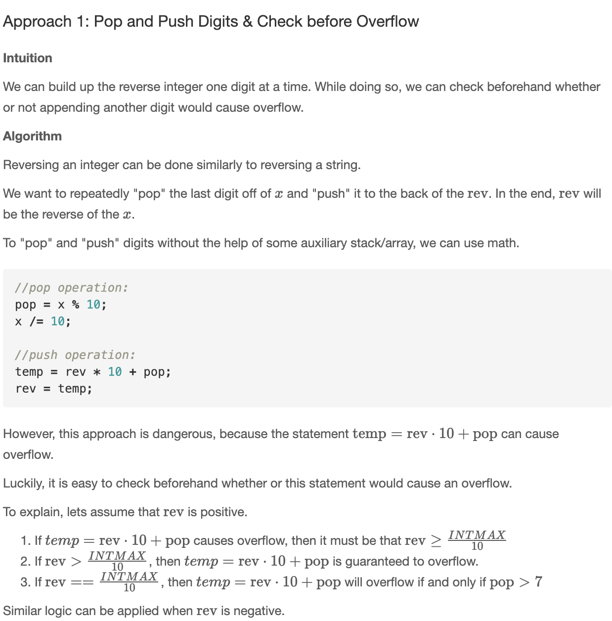 这是一道easy的题,需要考虑到的点有余数、除数、以及reverse之后可能会出现的溢出情况。 基本的思路很简单,当 x 不为0的时候,取x/10的余数,然后x/=10,同时开了判断溢出的情况。