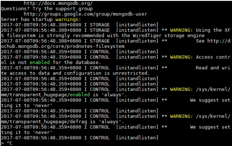 第一个错误WARNING: Using the XFS filesystem is strongly recommended with the WiredTiger storage engine是指:强烈建议使用带WiredTiger存储引擎的XFS文件系统,这个不用管它,无需管它