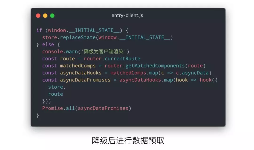 我们参考 Nuxt.js 中对 asyncData 的操作,在 asyncData 钩子中获取数据后直接将数据对象返回,然后与组件中的 data 函数的对象进行混合,页面组件可以像操作 data 一样操作 asyncData 返回的数据,这样就可以很好的与 Vuex 解耦(官方推荐的做法是将 asyncData 中获取的数据存到 Vuex 中,组件从 Vuex 中取数渲染)。