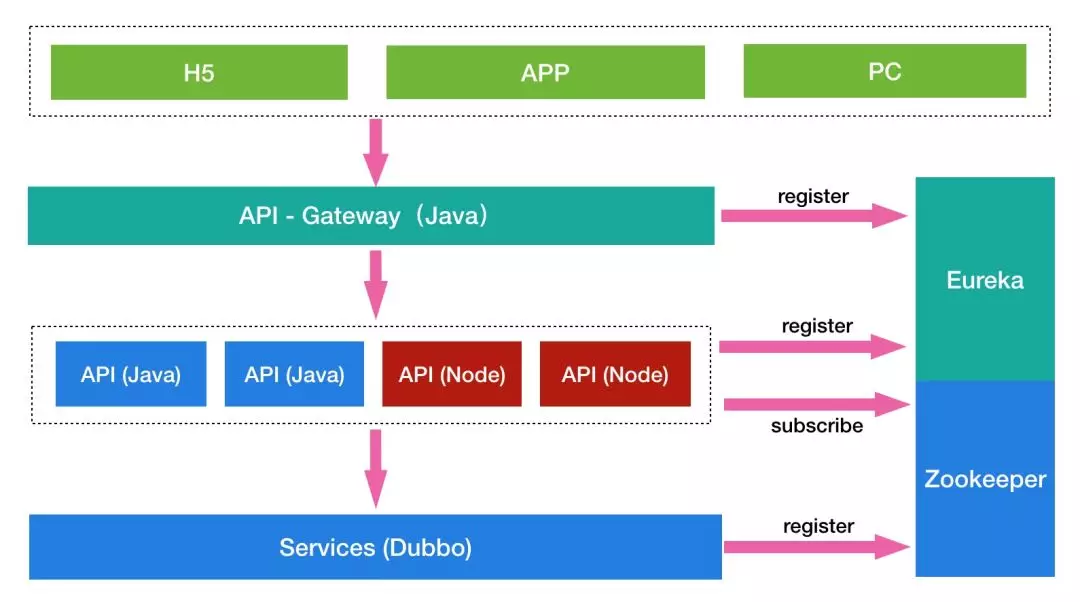 上面这张图展示了 Node.js 在整个微服务架构中的位置,最上层的是一些端应用,当一个请求发起时首先会经过 Java 的网关,网关作为微服务的唯一入口,进行请求的分发和通用逻辑的处理,网关下面是一些 API 服务,用来提供 HTTP 接口,最底层是更加原子化、细粒度的 Dubbo 服务。Eureka 是网关和 API 层的注册中心,Zookeeper 是 Dubbo 层的注册中心。Node.js 在 API 层主要做了以下工作。