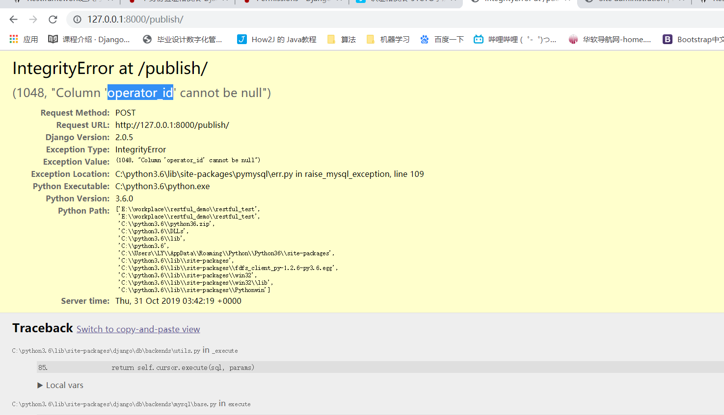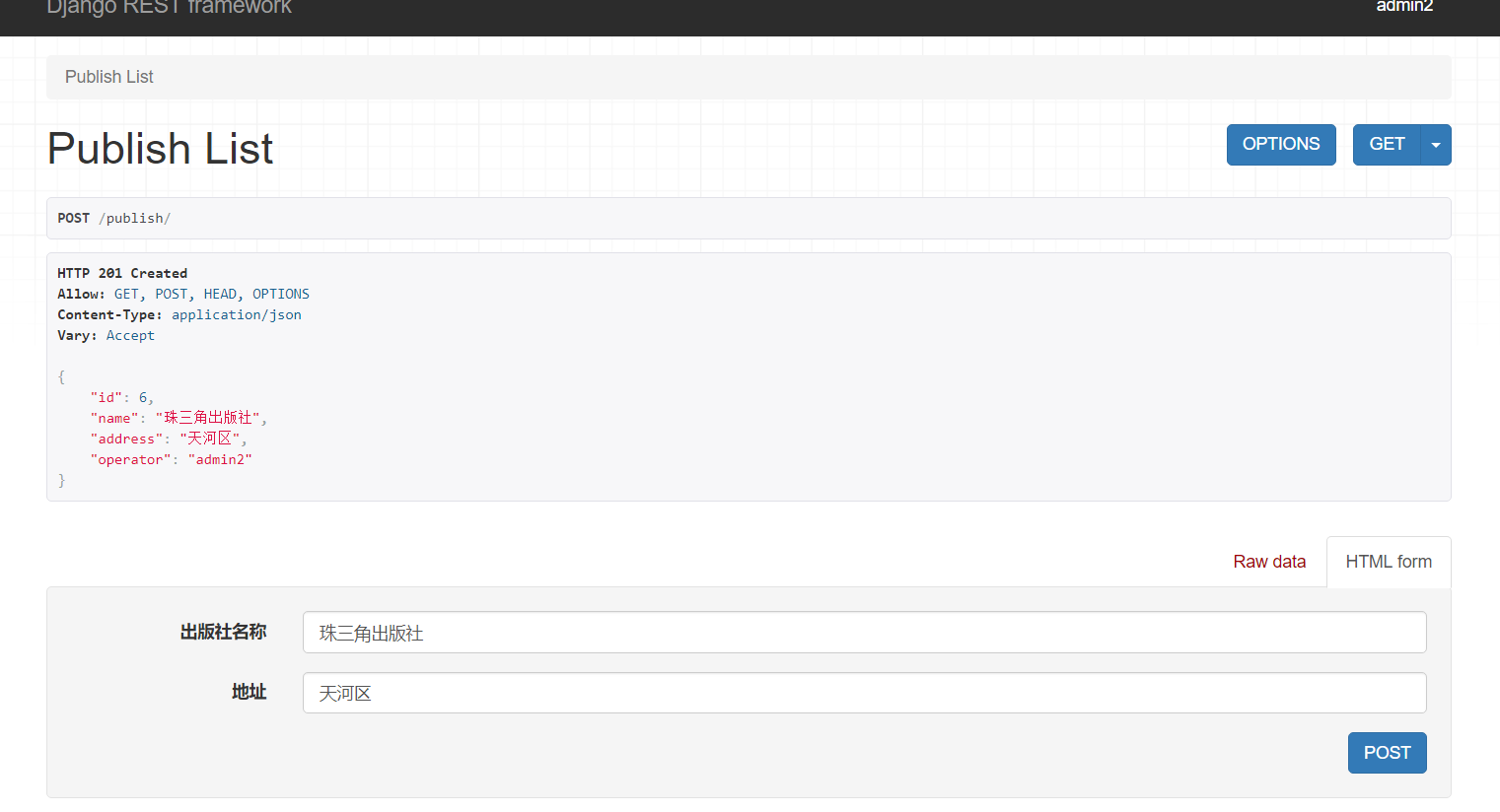 序列化没有自己的save方法,默认存储方法是在ModelSerializer里面的,也就是在Model里面保存,但是我新建的用户admin2添加一个字段,他的operator_id都不知道去哪里找,如果使用admin2去添加API数据的话,会出现如下情况: