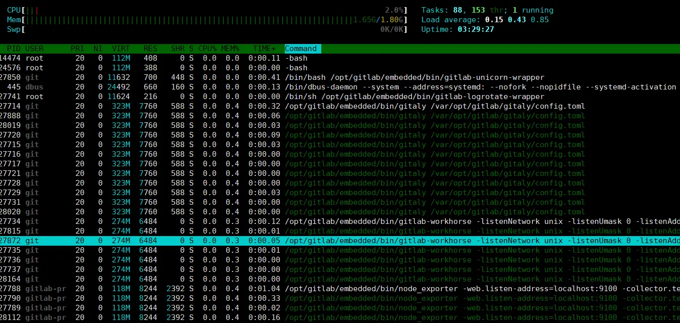 但是最大的问题就是内存爆满,用命令看看free -h,或者用htop没有htop命令就下载一下yum install htop