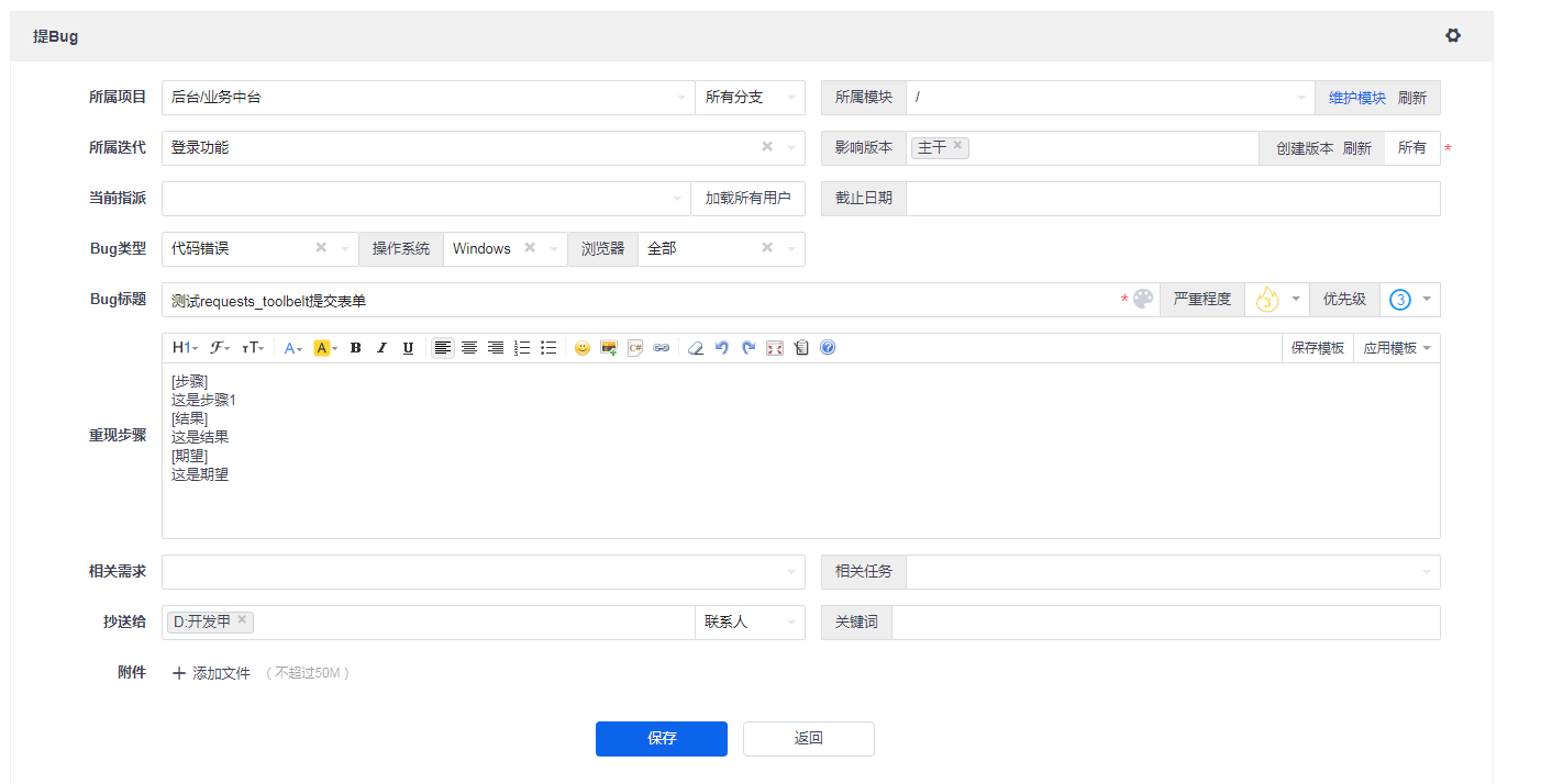 这里安静通过举个小栗子来更加理解requests-toolbelt的用法,这里通过禅道提bug的接口