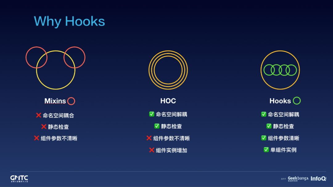 最后我们来看一下 Hooks,紫色的圈圈是 Hooks,就像图里一样,Hooks 都在同一个组件里,Hooks 之间还可以相互调用。因为 Hooks 跑在一个普通函数式组件里,所以他肯定是没有命名空间的问题,同时 TypeScript 也能对普通函数做很好的静态检查,而且 Hooks 也不能更改组件的 Props,传入的是啥最后可用的就是啥; 最后 Hooks 也不会生成新的组件,所以他是单组件实例。