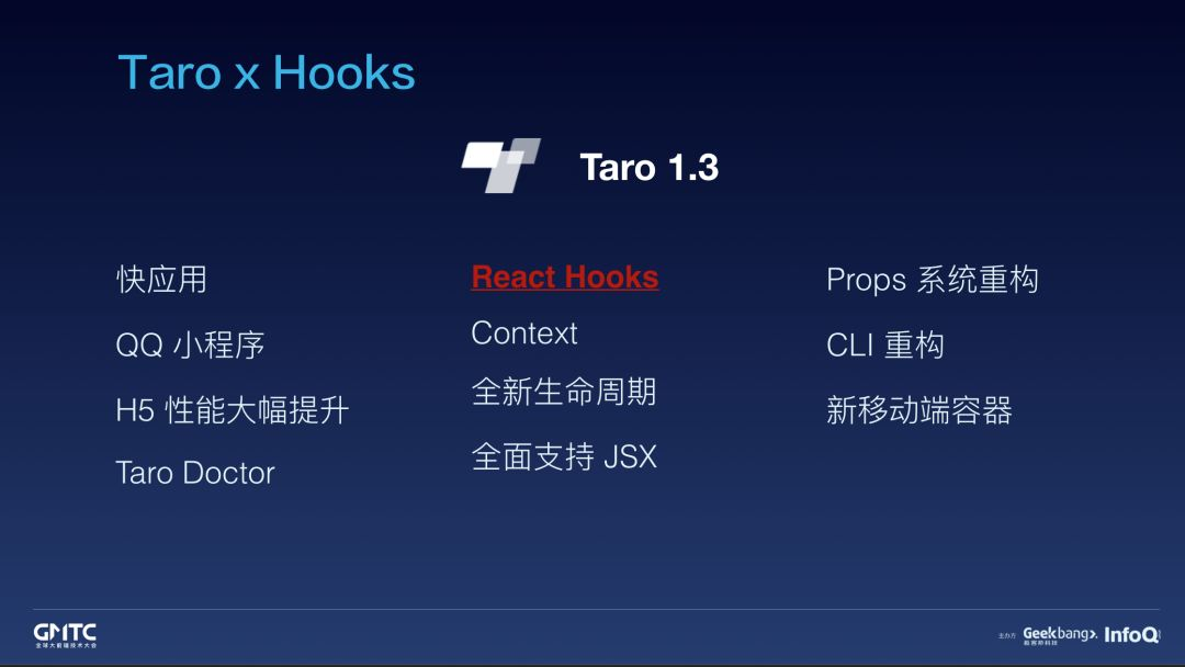 在 Taro 1.3 版本,我们实现了一大堆特性,其中的重头戏就是 React Hooks 的支持。虽然 React Hooks 正式稳定的时间并不长,但我们认为这个特性能有效地简化开发模式,提升开发效率和开发体验。即便 Hooks 的生态和最佳实践还尚未完善,但我们相信未来 Hooks 会成为 React 开发模式的主流,也会深刻地影响其它框架未来的 API 构成。 所以在 Taro 的规划中我们也把 Hooks 放在了很重要的位置。
