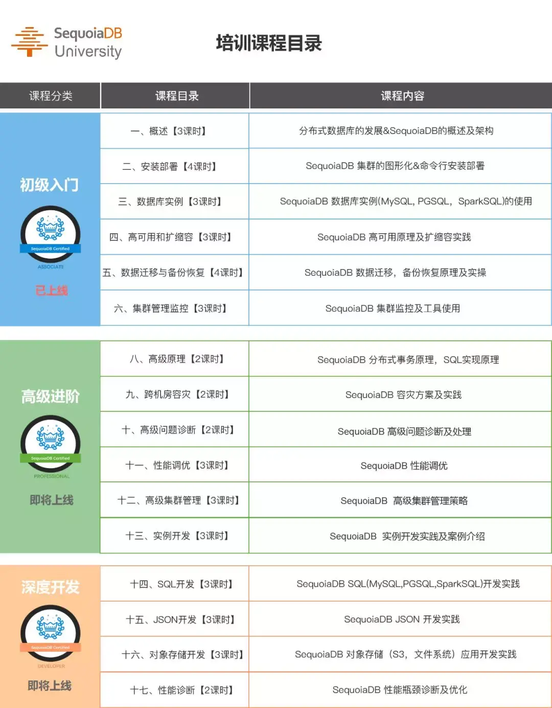 目前,初级入门培训课程和其对应的 SCDA 认证考试均已正式开放学习和注册,欢迎进入 SequoiaDB University 官网 (详情请点击这里)开始学习。