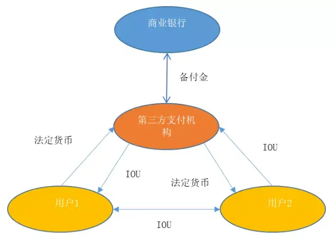 图1给出“断直连”前第三方支付中的资金流向。其中,用户在第三方支付机构的余额,本质是IOU(I Owe You),不计付利息;用户在第三方支付机构充值和提现涉及的法定货币,实际上是他们在商业银行的存款。
