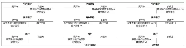 图7给出DC/EP有关各方的资产负债表及它们在数字货币发行/回笼和存/取等场景下的变化,其中drr表示存款准备金率。图7中间表示中央银行向商业银行发行数量为A的数字货币的场景,商业银行在中央银行的存款准备金减少A(A小于0表示回笼)。图7右边表示用户向商业银行取出数量为B的数字货币的场景,用户在商业银行的存款减少B(B小于0表示存回数字货币)。