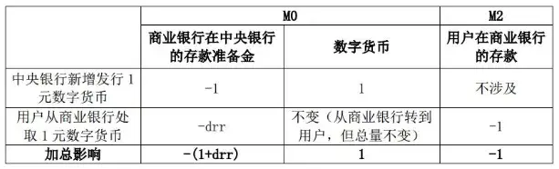 其次,DC/EP对M0、M2和货币乘数M2/M0的影响。第三部分已涉及这个问题,表3给出了严谨分析。表3假设用户从商业银行处取1元数字货币,而这1元数字货币来自于中央银行的新增发行。表3说明,从中央银行新发行1元数字货币到其为用户持有, M0减少drr元,M2减少1元。