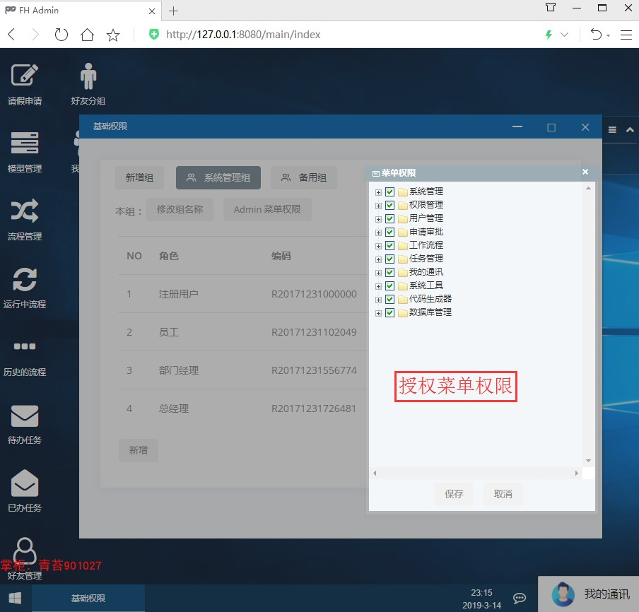 . 权限管理:点开二级菜单进入三级菜单显示 角色(基础权限)和按钮权限角色(基础权限): 分角色组和角色,独立分配菜单权限和增删改查权限