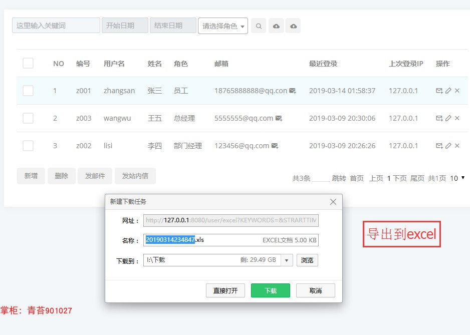 . 系统用户:对各个基本的用户增删改查,导出到excel表格,批量删除8