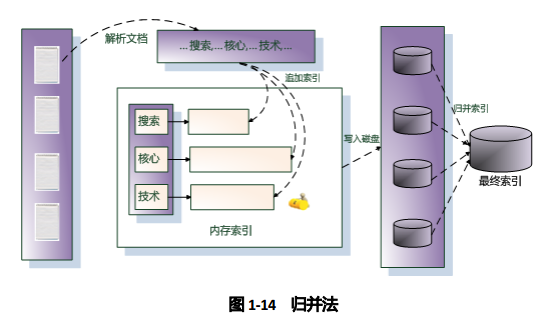 - 归并法- --处理文档--->内存数据写入磁盘--->合并索引与词典---->最终索引文件