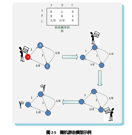 - 假设在时刻 1,用户浏览页面 A,之后经由链接进入页面 B,然后进入页面 C,此时面临两种可能选择,跳转进入页面 A 或者页面 B 皆可,两者概率相同,都为 1/2。