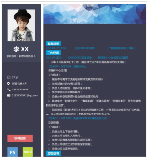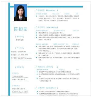 我建议是采用从上到下依次展示模块的方式,因为人普遍是比较容易接受中规中矩的从上到下的阅读顺序的,一旦需要上下左右的连续切换时,时间长了也就容易视觉疲劳,所以我推崇越简单越好的从上到下的排版模式(如图4),而不建议使用左右排版的方式,例如左边侧边栏放置个人信息模块,右边放置工作经验等模块(如图3),排版简单可能会增加面试官对你的印象分。