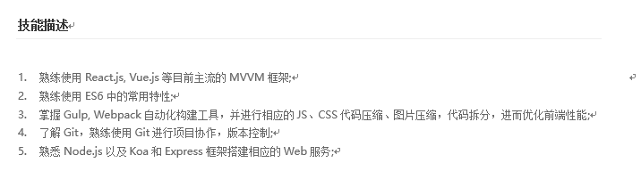 (1) 内容条理清晰,多个不同的技能采用阿拉伯数字以有序列表的方式从上到下进行排序,给面试官一种干净整洁的感觉