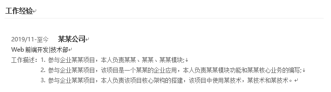 这部分是第四个模块,这部分内容主要是用来描述你到目前为止工作过的公司履历,如果你是刚毕业,你也可以将自己的实习公司写上去,但是前提是你的工作内容是前端,而不是其他不相关的行业。如果你是工作多年的老手,你也没必要将每个公司都写进去,写你最近的比较自豪的几个公司就行了,不要给人一种跳槽频繁的印象,工作经验中可以包含以下几点: