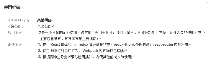 (3) 责任描述要清晰,责任描述主要是描述你在该项目中所负责的具体内容,这部分内容包含了你在代码层面的具体实践,从HTML5和CSS3的页面布局,到ES6逻辑编写,到路由跳转控制,到数据状态管理,到自动化工具打包构建,到部署上线,一系列的流程都可以往上面写,同样建议采用阿拉伯数字以有序列表的方式进行排序,重要的在前,不重要的在后,条理清晰总是会给人留下深刻的印象(如图8)