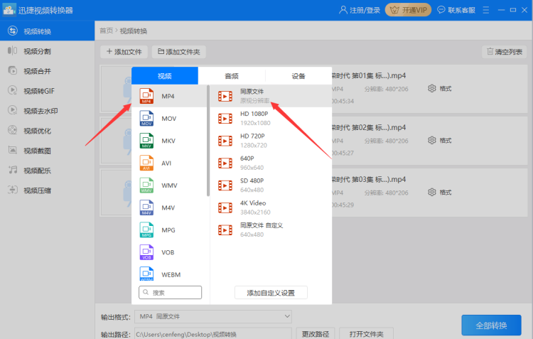 2、把视频添加到软件后可以先对“输出格式”进行设置,输出格式又分为输出的视频格式和视频分辨率,因为视频格式中‘mp4’占用内存相对较小且兼容性较好所以通常把输出的视频格式设置为‘mp4’,分辨率一般则设置为和原视频相同的‘同原文件’格式。