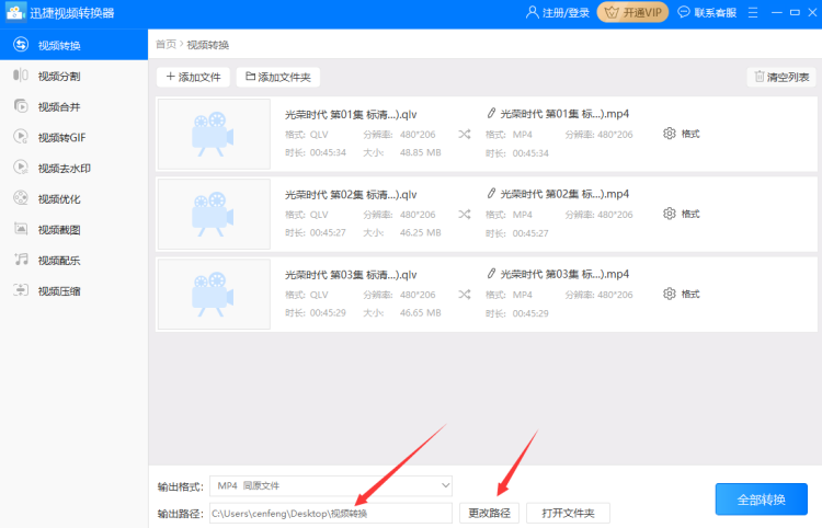 4、以上都设置好后点击软件右上角的“转换”或者右下角的“全部转换”按钮就可以把添加好的qlv格式从上往下依次转换成mp4并输出到指定路径中。