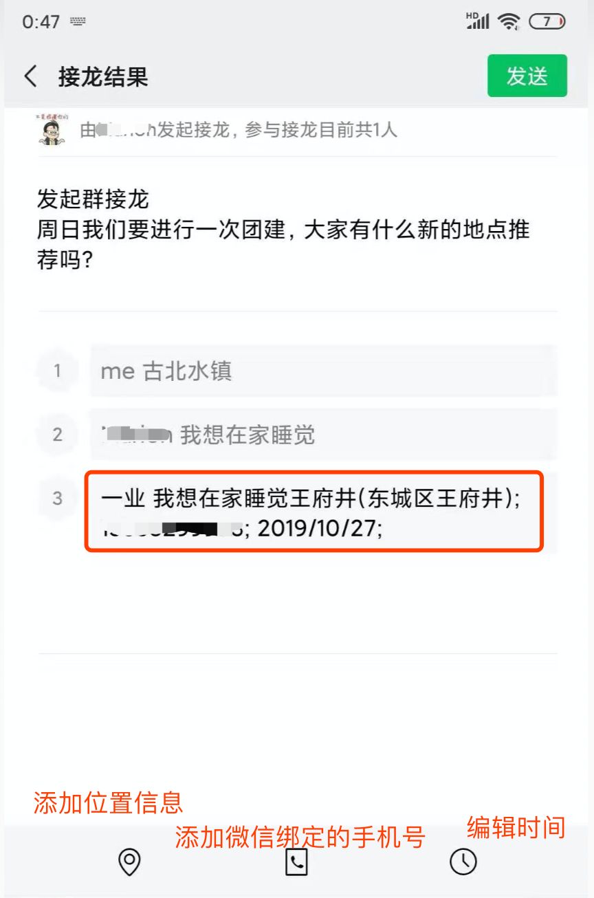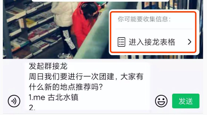 发起群接龙周日我们要进行一次团建,大家有什么新的地点推荐吗?1.me 古北水镇2. #注意输入到这里的时候,微信就会有对应的提示了,如下图