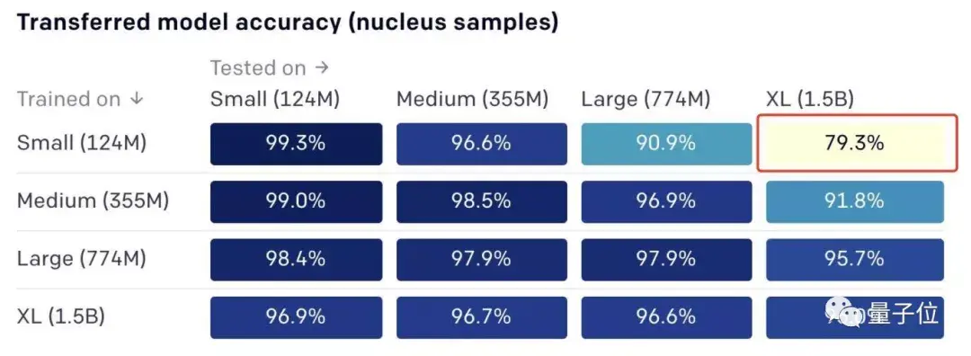 比如,用1.24亿参数模型的文章训练之后,再让算法识别15亿参数模型的作品,准确率只有79.3%。反过来,准确率有96.9%。